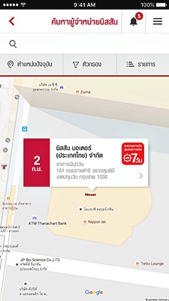 - ค้นหาโชว์รูมและศูนย์บริการของผู้จำหน่ายฯนิสสัน ที่ใกล้ที่สุด พร้อมข้อมูลการติดต่อ สะดวกต่อการนำรถเข้าตรวจสอบเมื่อเกิดความผิดปกติหรือเหตุฉุกเฉินขึ้น