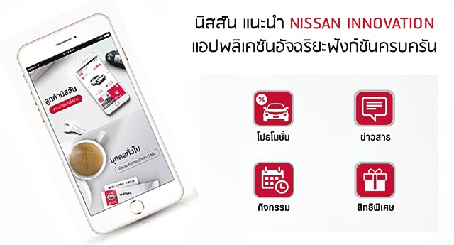 นางสาว สุรีทิพย์ ละอองทอง โฉมทองดี รองกรรมการผู้จัดการใหญ่ การตลาด บริษัท นิสสัน มอเตอร์ (ประเทศไทย) จำกัด เปิดเผยว่า นอกจากการคิดค้นนวัตกรรมใหม่ๆ ให้กับตัวสินค้า ดังเช่นเทคโนโลยีของการเคลื่อนที่อัจฉริยะ หรือ Intelligent Mobility ภายใต้แนวคิดการมุ่งเน้นนำเสนอนวัตกรรมที่ตื่นเต้นและเร้าใจ (innovation that excites) ทำให้นิสสันไม่หยุดนิ่งที่จะสร้างความพึงพอใจสูงสุดให้แก่ลูกค้าอย่างต่อเนื่อง โดยล่าสุดได้สร้างการติดต่อสื่อสารกับลูกค้าและประชาชนทั่วไปที่ชื่นชอบและสนใจในผลิตภัณฑ์รถยนต์รุ่นต่างๆ รวมถึงเรื่องของแบรนด์ อาทิ มอเตอร์สปอร์ต และเทคโนโลยีล้ำสมัยต่างๆ ด้วยการเปิดตัวแอปพลิเคชันอัจฉริยะ นิสสัน อินโนเวชันนี้ขึ้น