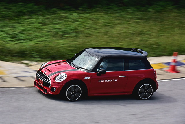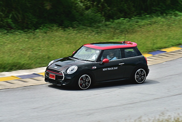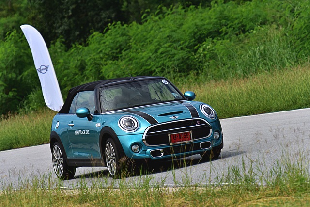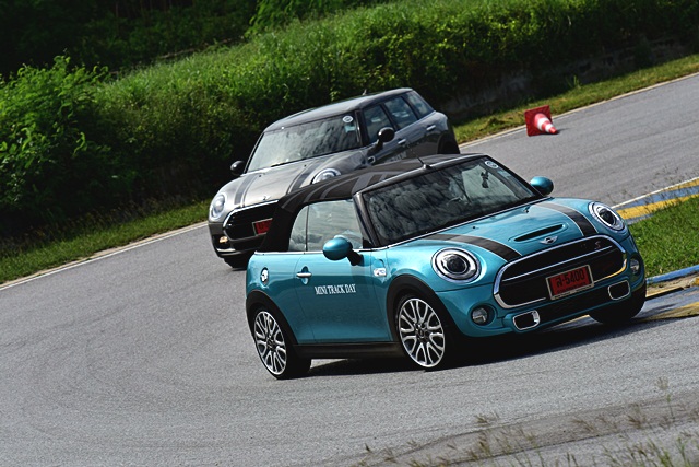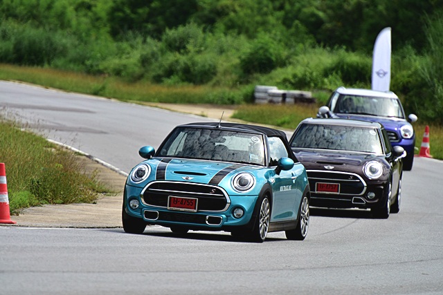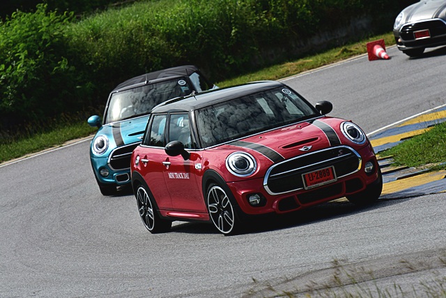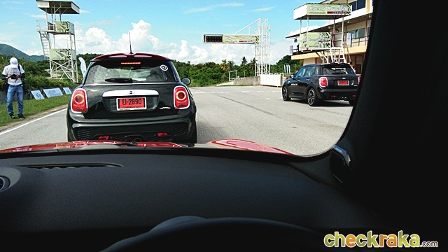 Sport ปรับระบบเครื่องยนต์และเกียร์ให้มีรอบสูงขึ้นเพื่อพร้อมในการเร่งตลอดเวลาและระบบช่วงล่างที่หนึบมากขึ้น ให้อารมณ์ น้องๆ "รถแข่ง" ทั้งหนึบ เกาะถนน พร้อมระบบพวงมาลัยให้ควบแม่นยำและเฉียบคมมากขึ้น โยกเพียงเล็กน้อยก็บังคับทิศทางได้ฉับไวมากๆ จนต้องทำความคุ้นเคยสักระยะ เพราะว่าความไวของพวงมาลัยที่มากขึ้นกว่าปกตินั่นเอง Normal ใช้ในการขับขี่ปกติ ให้ความนุ่มนวล แต่ก็สามารถซิ่งได้หายห่วง เพราะยังให้ความเกาะถนนและมั่นใจตามสไตล์ "มินิ" Green โหมดนี้เน้นประหยัด ขับสบายๆ ไปเรื่อยๆ คล้ายโหมด Eco ของรถทั่วไปครับ ซึ่งในวันทดสอบนั้นไม่ได้ใช้ เพราะชอบโหมดสปอร์ตมากกว่า ขับมันมากๆ ในการขับขี่ในสนามนั้นมีรถทั้งหมด 6 รุ่น 12 คัน คันละ 2 คน ให้ผู้ร่วมทดสอบขับคนละ 3 รอบ และสลับผู้ขับ จากนั้นก็สลับรถยนต์และขับทดสอบไปเรื่อยๆ จนครบทุกรุ่น ซึ่งจะมีรถนำหน้า (instructor) คอยควบคุมความเร็วและขับตามเรสซิ่งไลน์ พร้อมกับบนแทร็คก็มีกรวยยางวางมาร์คจุดเอาไว้ตามโค้งหรือเนินต่างๆ เพื่อบังคับให้ผู้ขับทดสอบวิ่งตามเส้นทางที่กำหนดไว้ เพื่อความปลอดภัย