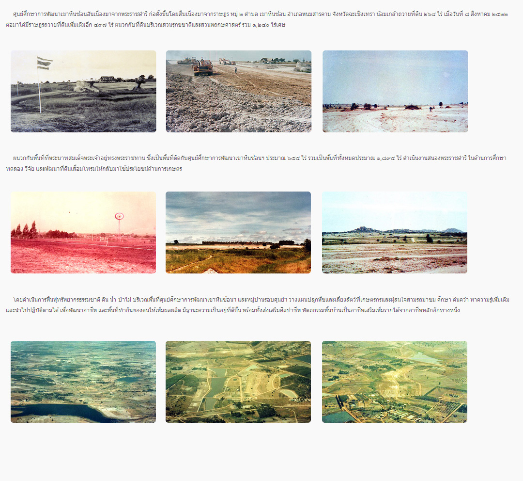 แทบไม่น่าเชื่อสายตาว่า พื้นที่แห่งนี้เคยเป็นดินทรายมาก่อน แม้แต่จะปลูกมันสำปะหลังก็ยังไม่ขึ้น เพราะดินเสียหมดแล้ว แต่เพราะพ่อหลวงของเราที่ทรงงานหนักและมีสายพระเนตรอันกว้างไกล แม้หลายฝ่ายทูลเกล้าว่าพัฒนาไปก็เสียเวลาเปล่าเพราะดินเสียหมดแล้ว ซึ่งในวันนั้นทรงได้ตรัสกับข้าราชบริพารทั้งหลายเหล่านั้นในทำนองว่า "หากไม่มีคนเริ่มก็ไม่สำเร็จ ฉะนั้นเราจะเป็นผู้เริ่มเอง" จากปี 2522 ถึงปัจจบัน (2559) นับเป็น 37 ปี ที่คนในพื้นที่เห็นประโยชน์ที่พระองค์ได้ทรงริเริ่มไว้แล้ว นับเป็นพระมหากรุณธิคุณอันหาที่สุดมิได้