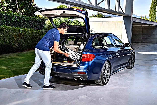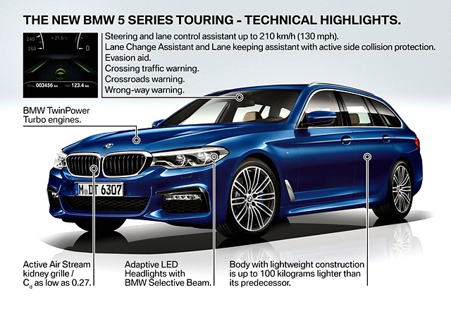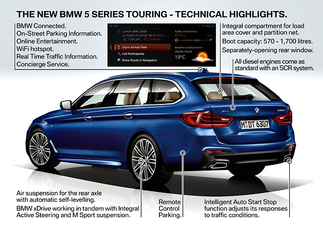 ซีรีส์ 5 ทัวร์ริ่งใหม่ ใช้แชสซีส์น้ำหนักเบา เทคโนโลยีแบบเดียวกับในรุ่นตัวถังซีดาน โดยเพิ่มช่วงล่างถุงลมปรับอัตโนมัติ พื้นที่ด้านท้ายมีความจุมากถึง 570 ลิตร ถ้าพับเบาะหลังก็จะได้พื้นที่เพิ่มเป็น 1,700 ลิตร โดยเบาะหลังสามารถแยกพับได้แบบ 40:20:40 ส่วนฝาท้ายทำงานแบบออโต และกระจกแยกเปิดได้