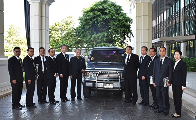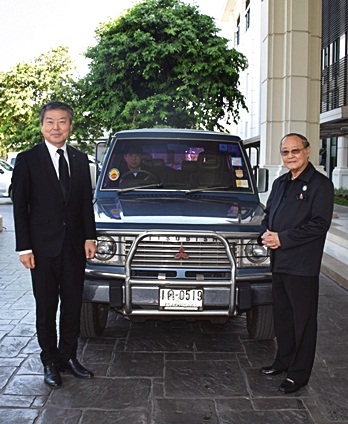 ดร. สุเมธ ตันติเวชกุล กรรมการและเลขาธิการมูลนิธิชัยพัฒนา (ที่ 6 จากซ้าย) ให้เกียรติถ่ายภาพร่วมกับ บริษัท มิตซูบิชิ มอเตอร์ส (ประเทศไทย) จำกัด นำโดย มร. โมะริคาซุ ชกกิ กรรมการผู้จัดการใหญ่ (ที่ 5 จากซ้าย) พร้อมทีมผู้บริหารและผู้แทนสหภาพแรงงานรถยนต์มิตซูบิชิแห่งประเทศไทย พร้อมด้วยรถยนต์ "มิตซูบิชิ ปาเจโร" เจเนอเรชั่นที่ 1 ที่ใช้งานในโครงการอันเนื่องมาจากพระราชดำริและโครงการพัฒนาอื่นๆ ของมูลนิธิชัยพัฒนากว่า 30 ปีจนถึงปัจจุบัน โดยรถอเนกประสงค์คันนี้ผ่านการใช้งานเป็นระยะทางรวมกว่า 1.3 ล้านกิโลเมตร