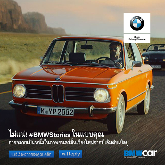 BMW Thailand ร่วมกับนิตยสาร BMWCar ชวนทุกคนร่วมกิจกรรม "บอกเล่าเรื่องราวของคุณไปกับ #BMWStories" เพียงแชร์เรื่องราว ภาพถ่าย หรือคลิปสั้นๆ กับรถ BMW ของคุณ ลงใต้โพสต์กิจกรรมที่ปักหมุดไว้ใน Facebook BMW Thailand ติดแฮชแท็ก #BMWStories และ #BMWTH เรื่องราวที่ถูกคัดเลือกจะถูกนำไปผลิตเป็นภาพยนตร์สั้นโดยผู้กำกับชั้นนำของประเทศ พร้อมบทสัมภาษณ์ในนิตยสาร BMWCar Magazine เผยแพร่ทั่วประเทศ