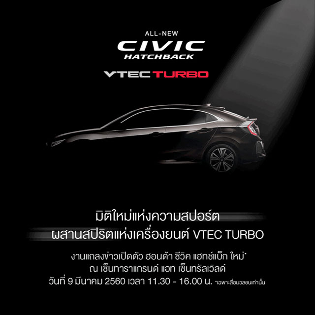 Honda Civic Hatchback (ฮอนด้า ซีวิค แฮทช์แบ็ก) ใหม่ เตรียมเปิดตัวแล้ว มาพร้อมเครื่องยนต์ขนาด 1.5 ลิตร VTEC Turbo 173 แรงม้า พร้อมเปิดตัวสู่สาธารณชนในวันที่ 9 มีนาคม 2560 นี้ ณ เซ็นทาราแกรนด์ แอท เซ็นทรัลเวิลด์ หลังจากที่ยิงโฆษณา Teaser ออกมาตั้งแต่ต้นเดือนที่ผ่านมา