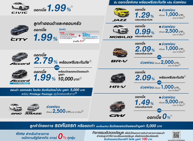 Honda มอบข้อเสนอพิเศษสุดๆ กับ "Extra Special" โปรโมชั่นสุดเร้า ดอกเบี้ยต่ำสุด 0% - 2.79% ฮอนด้าช่วยผ่อนสูงสุด 5,000 บาทต่อเดือน หรือ รับบัตรของขวัญ 10,000 บาท จองทุกรุ่นรับจักรยาน "โมดูโล" มูลค่า 6,000 บาท ฟรี 31 มี.ค.นี้พร้อมแคมเปญเพื่อข้าราชการ พนักงานรัฐวิสาหกิจ ดาวน์ 0% ทุกรุ่น และสำหรับลูกค้ารถคันแรกหรือจะเป็นรถเก่าและซื้อรถใหม่ รับบัตรของขวัญฮอนด้ามูลค่า 5,000 บาทรีบจองและซื้อรถยนต์ฮอนด้าวันนี้ ก่อน 31 มีนาคม 2560 ที่โชว์รูมฮอนด้าทั่วประเทศ 02-341-7777 ทุกวัน ตลอด 24 ชั่วโมง หรือ www.honda.co.th และรายละเอียดเพิ่มเติม คลิกเลย!แท็กที่เกี่ยวข้อง :