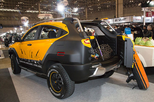 ด้านข้างมาพร้อมกับซุ้มล้อตีโป่งสีดำลากยาวถึงท้ายรถ ไม่มีกระจกบานหลัง ไฟท้ายเปลี่ยนใหม่ ฝาท้ายเปิด-ปิด ได้เหมือนรถกระบะ นอกจากนี้ยังเสริมเสาหลังคายาวตลอดแนว ช่วงล่างยกสูง และยาง Yokohama Geolander A/T-S พร้อมล้อแม็กชุดใหม่