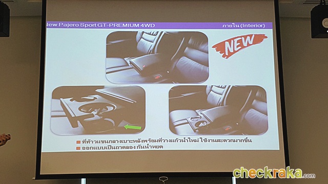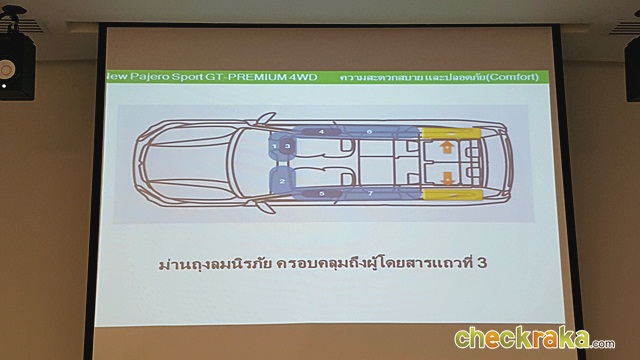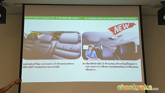 มิตซูบิชิ ปาเจโรใหม่ ภายในเบาะปรับไฟฟ้าคู่หน้า เพิ่มถุงลมนิรภัยผู้โดยสารแถวที่ 3 พร้อมเพิ่มเข็มขัดตำแหน่งที่นั่งกลางทั้งแถว 2 และ 3 เพื่อความปลอดภัยมากขึ้น และที่วางแก้วน้ำตรงเท้าแขนเบาะแถว 2