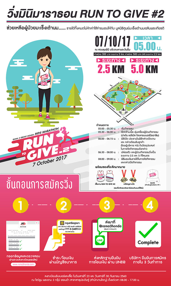"มินิมาราธาน เพื่อช่วยเหลือผู้ป่วยมะเร็งเต้านม RUN TO GIVE #2" รายได้ทั้งหมดไม่หักค่าใช้จ่าย มอบให้มูลนิธิศูนย์มะเร็งเต้านมเฉลิมพระเกียรติ กิจกรรมจะมีขึ้นในวันที่ 7 ตุลาคม 2560 เวลา 05.00 นาฬิกาเป็นต้นไป