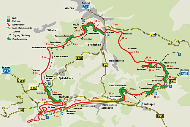 เนื่องจากสภาพภูมิประเทศที่เป็นหุบเขาคดเคี้ยว สนามแห่งนี้ถูกสร้างมาเพื่อใช้สำหรับแข่งขันรถยนต์สูตรหนึ่ง รายการเยอรมันกรังด์ปรีซ์ตั้งแต่ปี 1947 จนถึง 1970 ก่อนที่สนามจะงดจัดการแข่งขันไประยะหนึ่ง เนื่องจากความยากของเส้นทางและอันตรายของสภาพภูมิประเทศ ต่อมาสมาพันธ์ยานยนต์แห่งประเทศเยอรมัน (ADAC - Allgemeiner Deutscher Automobil Club) ได้ใช้สนามแห่งนี้เป็นหนึ่งในรายการ ADAC 24Hours Rennen Nurburgring ตั้งแต่ปี 1970 จนถึงปัจจุบัน