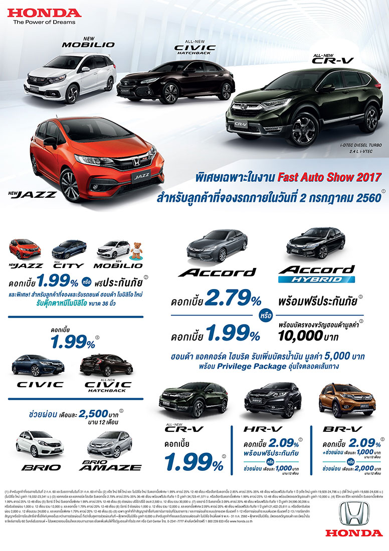 พิเศษ สำหรับลูกค้าที่จองรถยนต์ฮอนด้ารุ่นใดก็ได้ภายในงาน Fast Auto Show Thailand 2017 ระหว่างวันที่ 28 มิถุนายน - 2 กรกฎาคม 2560 และรับรถภายในวันที่ 30 กันยายน 2560 จะได้รับบัตรผ่านประตูสวนน้ำ วานา นาวา หัวหิน (Vana Nava Hua Hin) จำนวน 2 ใบ หรือ บัตรผ่านประตูคิดส์ซาเนีย กรุงเทพ (KidZania Bangkok) จำนวน 2 ใบ จากฮอนด้า