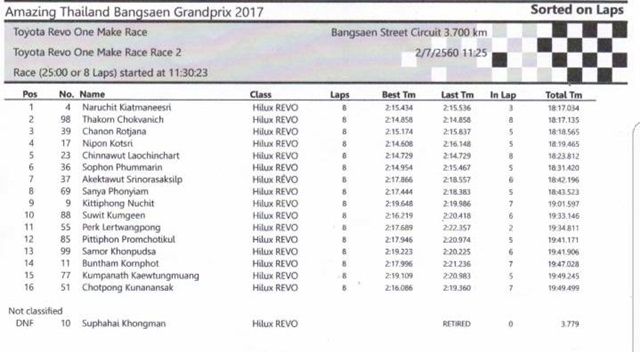 ไฮลักซ์ รีโว่ วันเมคเรซ กับเครื่องยนต์ 2,400 ซีซี บทพิสูจน์ของกระบะสายพันธุ์แกร่ง กับช่วงล่างที่หนึบและสมรรถนะที่แรงสุดขีด ที่มีรถลงแข่งขันทั้งสิ้น 17 คัน กับ 8 รอบ โดย นฤชิต เกียรติมณีศรี สามารถยึดครองตำแหน่งผู้นำ พร้อมคว้าอันดับที่1 ไปได้ในที่สุด ตามมาด้วย ธกร โชควนิช จากทีม SIRISHIN BLAZE RACING TEAM ในอันดับที่ 2 และ ชานนท์ รจนา จากทีม GT.RESIDENCE-PROSPEED-COMPACT TEAM ในอันดับ 3