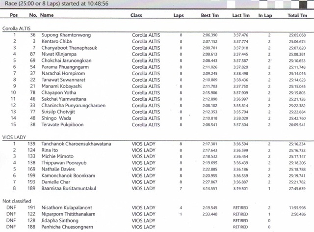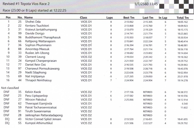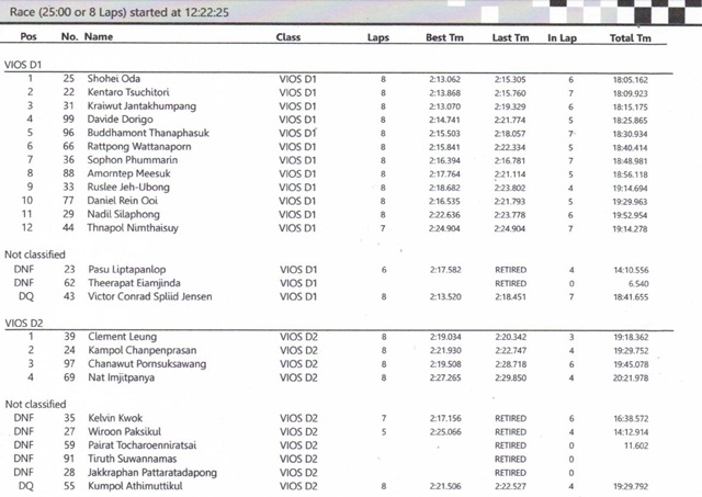 วีออส วันเมคเรซ ดิวิชั่น1 มีรถลงแข่งขันทั้งสิ้น 15 คัน กับการแข่งขัน 8 รอบสนาม โดยแชมป์สนามสองนี้ ตกเป็นของ Shohei Oda นักแข่งอิสระ โชว์ฟอร์มสุดเฉียบ ขึ้นนำตั้งแต่ออกสตาร์ทจนจบการแข่งขันในขณะที่อันดับ 2 เป็นของ Kentaro Tsuchitori จากทีม Advics RacingTeam และอันดับที่ 3 เป็นของ ไกรวุธ จันทะคำแพง จากทีม KYB SUPERCLUB RACING