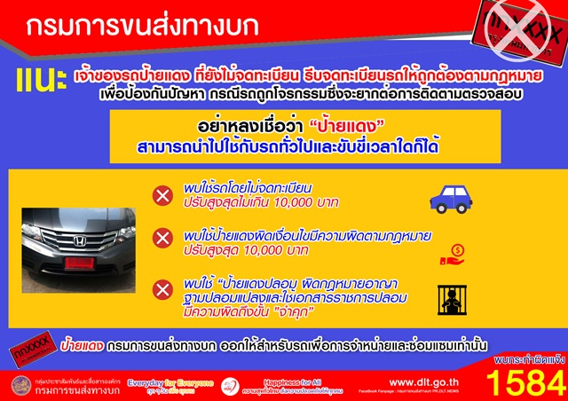 นายณันทพงศ์ฯ กล่าวเพิ่มเติมว่า กรมการขนส่งทางบกขอความร่วมมือผู้ที่ซื้อรถใหม่รีบนำรถมาจดทะเบียนให้ถูกต้อง สำหรับการจดทะเบียนรถใหม่ สามารถดำเนินการได้ภายในระยะเวลาเพียง 1 วัน เท่านั้น และจะได้รับแผ่นป้ายทะเบียนรถและเครื่องหมายการเสียภาษี (ป้ายวงกลม) เพื่อนำไปติดที่รถทันที ในวันที่นำรถมาจดทะเบียน เพียงนำหลักฐานการได้มาของรถ สำเนาทะเบียนบ้าน สำเนาบัตรประจำตัวประชาชน หลักฐานการทำ พ.ร.บ. โดยต้องนำรถเข้ารับการตรวจสภาพเพื่อความถูกต้อง เพื่อประโยชน์แก่เจ้าของรถ ณ กรมการขนส่งทางบก หรือ สำนักงานขนส่งจังหวัดที่ประสงค์จดทะเบียนรถ ขอให้เจ้าของรถดำเนินการจดทะเบียนรถใหม่ให้ถูกต้องตามกฎหมาย เพื่อไม่ต้องใช้รถป้ายแดงซึ่งอาจเป็นปัญหาในการติดตามตรวจสอบกรณีรถสูญหาย และเพื่อความสะดวกปลอดภัยในการใช้งานต่อไป สอบถามข้อมูลเพิ่มเติม โทร.1584