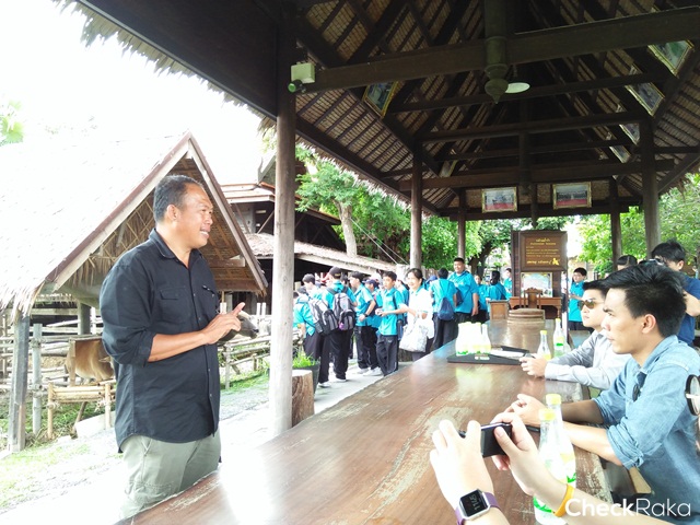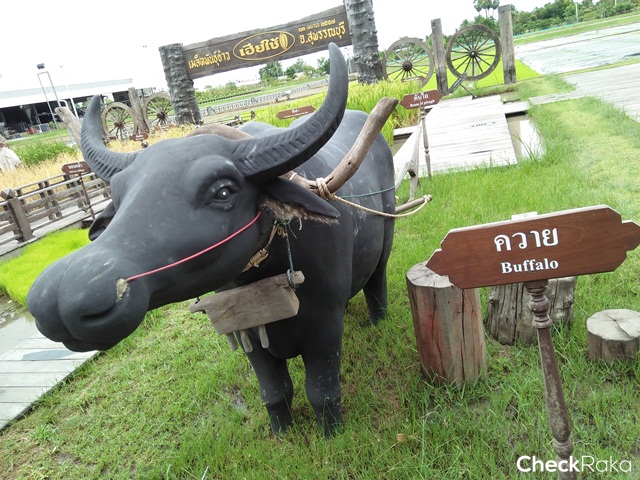 เมื่อถึงจุดหมายแรกคือ "นาเฮียใช้" ก็มีเจ้าหน้าที่ให้การต้อนรับพร้อมพาสื่อมวลชนที่เดินทางร่วมกันชมสถานที่ต่างๆ มากมาย ในพื้นที่กว่า 80 ไร่ ทั้งการเดินชมอาคารไม้ต่างๆ แปลงสาธิตการทำนา โรงเลี้ยงควายที่มีความน่ารักและเชื่องมากๆ ซึ่งคุณนิทัศน์ เจริญธรรมรักษา ทายาทของ "เฮียใช้" ได้ให้ฝากไว้ว่า "ควายไม่ได้โง่ให้ใครจูงจมูก เพราะถูกเจาะรูเอาไว้และร้อยเชื่อก เพื่อให้บังคับง่าย ซึ่งความจริงคนไทยต้องเห็นคุณค่าของควายว่าเป็นสัตว์ที่มีความอดทน ซื่อสัตย์ และมีคุณประโยชน์ต่อประเทศ"