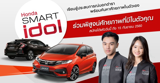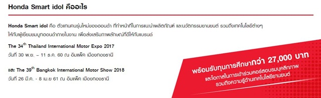 บริษัท ฮอนด้า ออโตโมบิล (ประเทศไทย) จำกัด เชิญชวนนิสิต นักศึกษา หนุ่มสาวคนรุ่นใหม่ ร่วมเรียนรู้ประสบการณ์การทำงานจริงกับฮอนด้า ผ่านโครงการ "Honda Smart Idol" ที่เปิดรับสมัครนิสิต นักศึกษา ที่มีความมั่นใจ บุคลิกภาพดี มีความสามารถ ไหวพริบปฏิภาณดี รักการเรียนรู้ และมีความรับผิดชอบ ในการเป็นตัวแทนของฮอนด้า แนะนำยนตรกรรมรุ่นใหม่ รวมทั้งเทคโนโลยีอันล้ำสมัยต่างๆ ให้กับผู้เยี่ยมชมบูธแสดงรถยนต์ฮอนด้าในงาน Thailand International Motor Expo ครั้งที่ 34 และงาน Bangkok International Motor Show ครั้งที่ 39 โดยตัวแทนที่ได้รับการคัดเลือกทั้ง 20 คน นอกจากจะได้เข้ารับการอบรมพัฒนาบุคลิกภาพ และเรียนรู้เรื่องเทคโนโลยียานยนต์ของฮอนด้าแล้ว ยังได้รับทุนการศึกษารวมมูลค่าทั้งสิ้น 540,000 บาทอีกด้วย