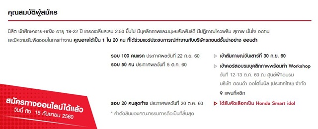 นิสิต นักศึกษา ที่มีอายุตั้งแต่ 18-22 ปี และมีเกรดเฉลี่ยสะสมตั้งแต่ 2.50 ขึ้นไป สนใจสมัครเข้าร่วมโครงการ Honda Smart idol สามารถเข้าไปกรอกใบสมัครผ่านทางออนไลน์ พร้อมอัพโหลด รูปถ่ายชุดนิสิต นักศึกษา และรูปถ่ายเต็มตัว รวมถึงเอกสารใบรับรองผลการเรียน หรือดูรายละเอียดเพิ่มเติม ได้ที่