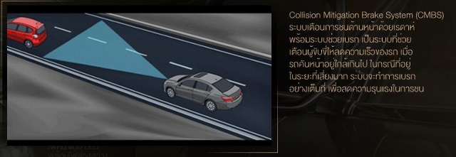 - Collision Mitigation Brake System (CMBS) ระบบเตือนการชนด้านหน้าด้วยเรดาห์พร้อมระบบช่วยเบรก เป็นระบบที่ช่วยเตือนผู้ขับขี่ให้ลดความเร็ว เมื่อรถคันหน้าอยู่ใกล้เกินไป และในกรณีที่อยู่ในระยะที่เสี่ยงมาก ระบบ CMBS จะทำการเบรกอย่างเต็มที่เพื่อลดความรุนแรงในการชน