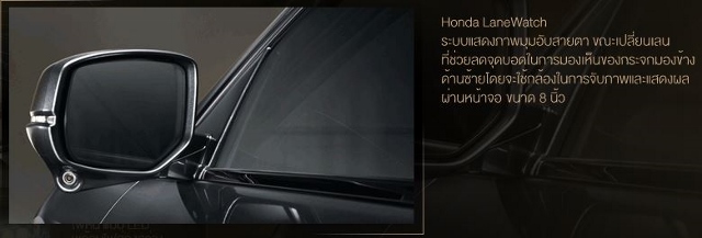 - Honda LaneWatch ระบบแสดงภาพมุมอับสายตาขณะเปลี่ยนเลน ช่วยลดจุดบอดในการมองเห็นของกระจกมองข้างด้านซ้าย โดยจะใช้กล้องในการจับภาพและแสดงผลผ่านหน้าจอขนาด 8 นิ้ว
