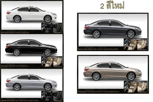 แอคคอร์ด ใหม่ มีให้เลือก 5 สี ได้แก่ ขาวออร์คิด (มุก), เงินอลาบาสเตอร์ (เมทัลลิก), ดำคริสตัล (มุก) และ 2 สีใหม่ ได้แก่ เทาโมเดิร์นสตีล (เมทัลลิก) และสีทองแชมเปญฟรอสต์ (มุก)