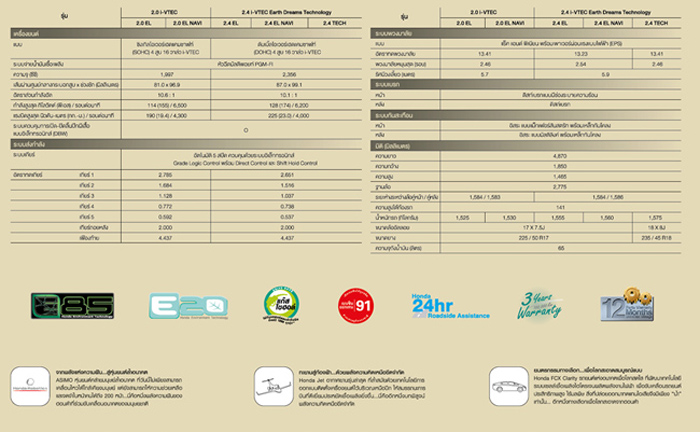 - เครื่องยนต์ 4 สูบ 16 วาล์ว แบบ DOHC i-VTEC ขนาด 2.4 ลิตร พร้อมนวัตกรรมเทคโนโลยีเครื่องยนต์ "เอิร์ธ ดรีม" ที่เป็นมิตรต่อสิ่งแวดล้อมและมีสมรรถนะการขับขี่ที่คล่องตัว ประหยัดน้ำมันดีเยี่ยม ด้วยกำลังสูงสุด 174 แรงม้า ที่ 6,200 รอบต่อนาที และให้แรงบิดสูงสุดที่ 225 นิวตัน-เมตร (23.0 กก.-ม.) ที่ 4,000 รอบต่อนาที ได้แก่ รุ่น 2.4EL, 2.4EL (Navi) และ 2.4 TECH