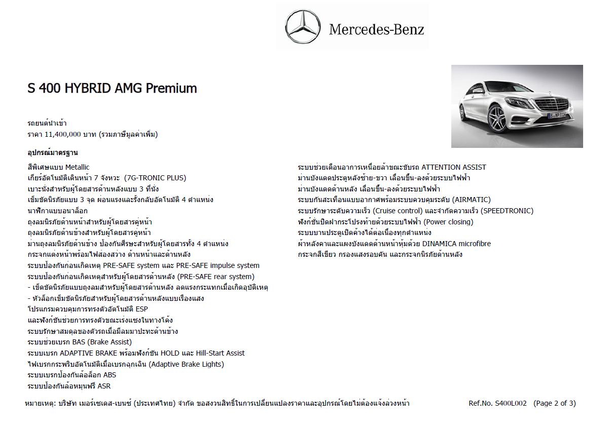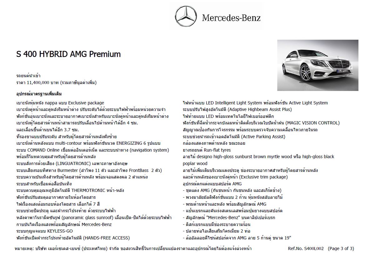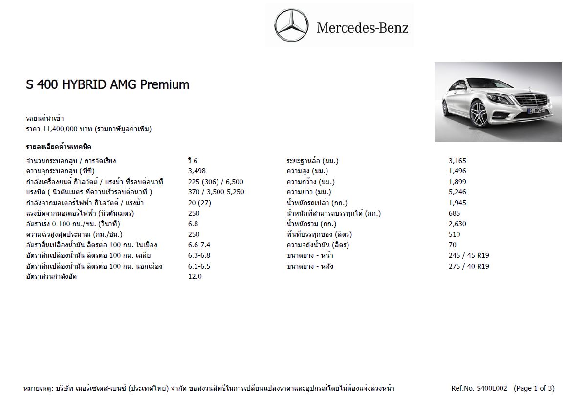 ข้อมูลทางเทคนิค Mercedes-benz S 400 HYBRID AMG Premium