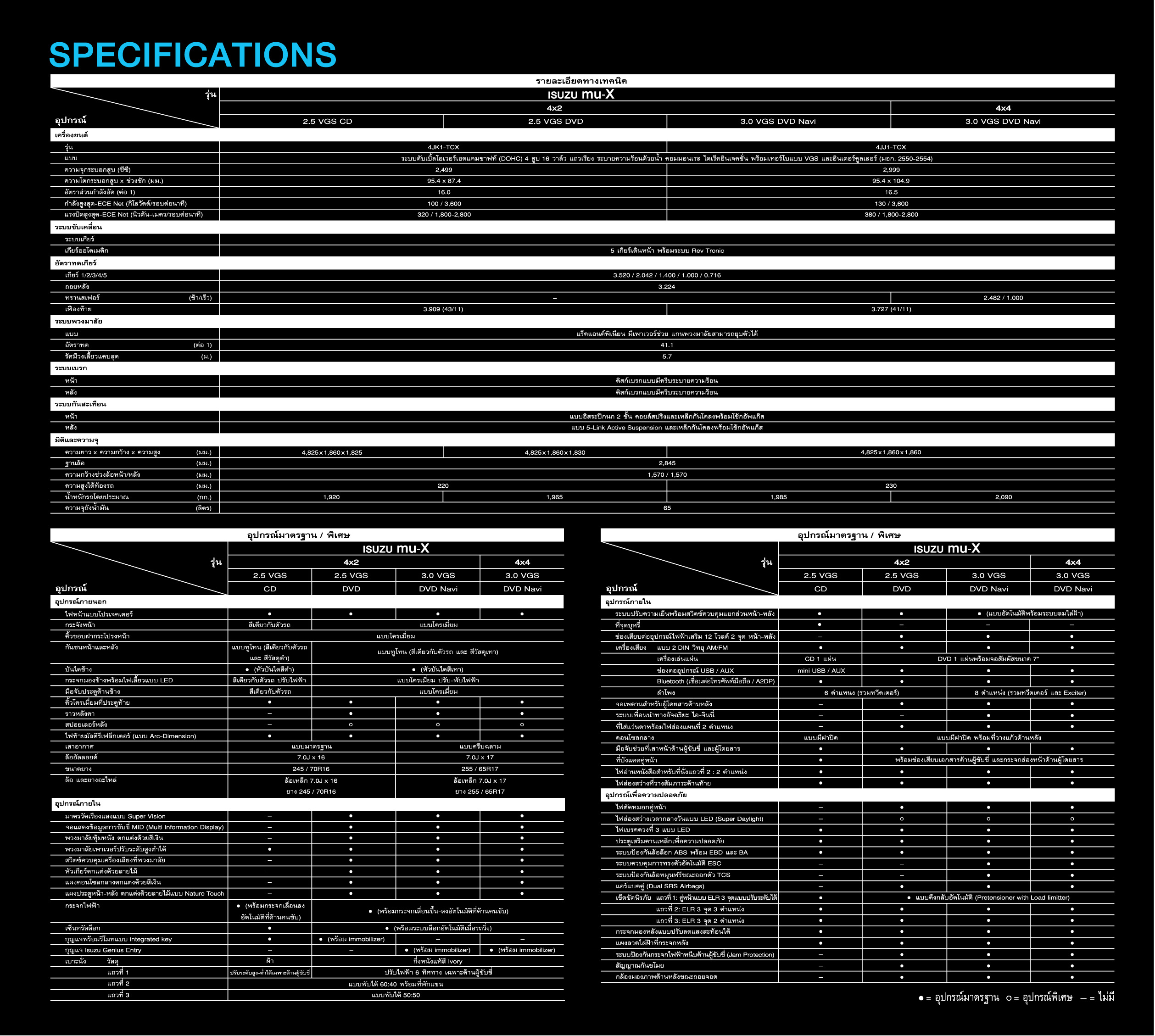 เอกสิทธิ์แห่งทางเลือกเหนือระดับกับ "อีซูซุมิว-เอ็กซ์" เกียร์อัตโนมัติ เครื่องยนต์ซูเปอร์คอมมอนเรล 3000 Ddi มีให้เลือกทั้งระบบขับเคลื่อน 2 ล้อ และขับเคลื่อน 4 ล้อ และเครื่องยนต์ซูเปอร์คอมมอนเรล 2500 Ddi ระบบขับเคลื่อน 2 ล้อ รวม 4 รุ่น ได้แก่