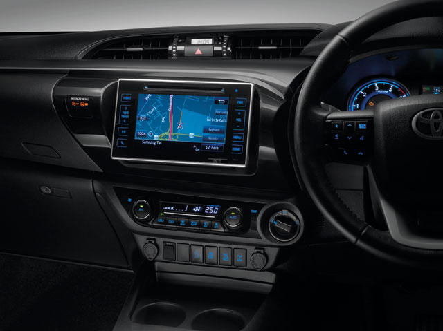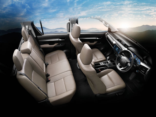 ภายในออกแบบให้เหมือนซีดานหรูหรามากขึ้น เกินรถกระบะ ทั้งคอนโซลหน้าที่ใช้ DNA ใกล้เคียงกับรุ่นย่อยอื่นๆ ของโตโยต้า แผงมาตรวัดแบบเรืองแสง พร้อมจอ LCD แบบ 3 มิติบอกสถานะต่างๆ พวงมาลัยปรับได้ 4 ทิศทาง พร้อมปุ่มควบคุมเครื่องเสียง, ควบคุมความเร็ว, รับ-วางสายโทรศัพท์ และสั่งงานดูข้อมูลในจอบนหน้าปัด ถัดมาทางด้านซ้ายของคอนโซลมีช่องแช่เย็นมาให้ด้วย สะดวกทุกการเดินทาง