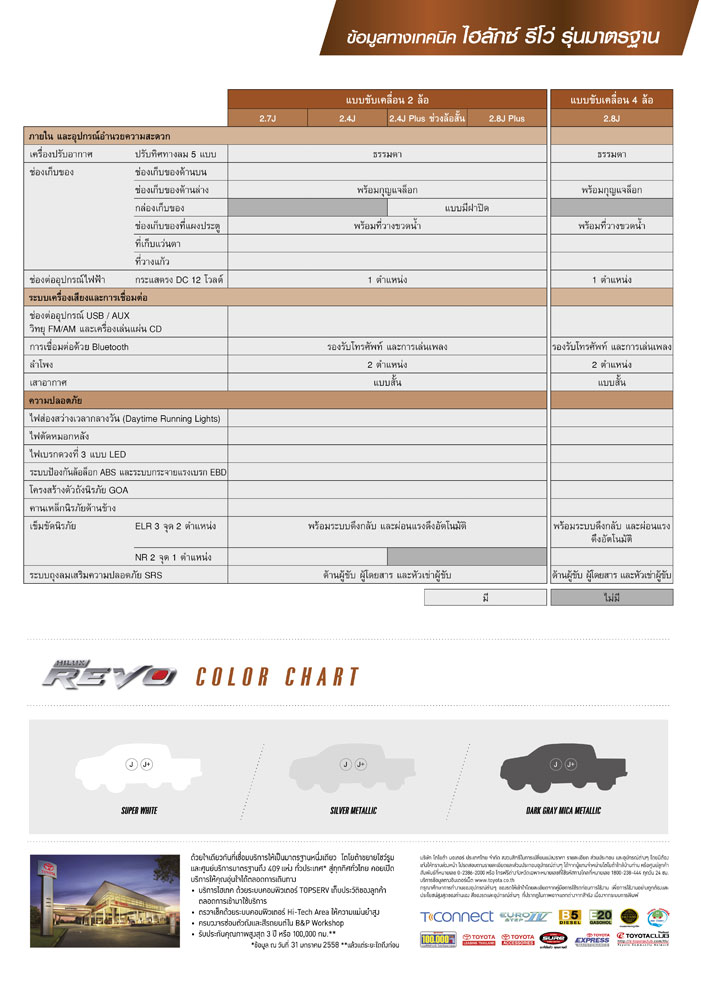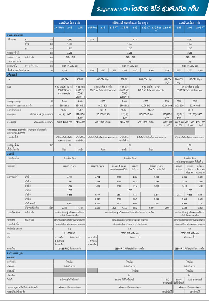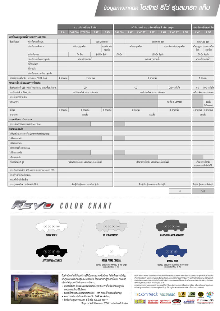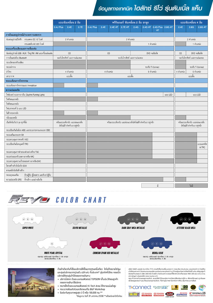 โตโยต้า รีโว ใหม่ มี 3 แบบตัวถังให้เลือกและอีก 33 รุ่นย่อย พร้อมราคาดังนี้ Strandard Cab 4X4 (ดูตารางสเปค 1 2 3)