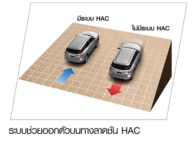 - ระบบช่วยออกตัวบนทางลาดชัน HAC (Hill-start Assist Control) ระบบจะเพิ่มแรงดันเบรกไปยังล้อทั้ง 4 อัตโนมัติ ป้องกันรถไหลในจังหวะออกตัว บนทางลาดชัน เพื่อความมั่นใจในทุกสถานการณ์การขับขี่