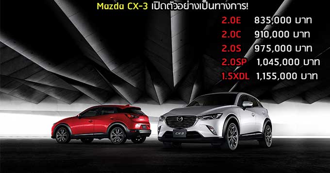 Mazda CX-3 ใหม่ เพิ่มทางเลือกให้รถยนต์ระดับ Crossover หรือจะเรียกว่า MINI SUV ก็ได้ รูปลักษณ์ยังคงรักษา DNA วิถีแห่งมาสด้าโคโดะดีไซน์ "Soul of Motion" ในคอนเซปต์ Freestyle Crossover เน้นกลุ่มผู้มีไลฟ์สไตล์ที่หลากหลาย ชอบความคล่องตัวและสมรรถนะสูงพร้อมความประหยัด ในขณะที่ให้ความอเนกประสงค์ได้ครบถ้วนทุกการใช้งาน เปิดตัวด้วยราคาเริ่มต้นที่ 835,000 บาท (Mazda CX-3 2.0E)