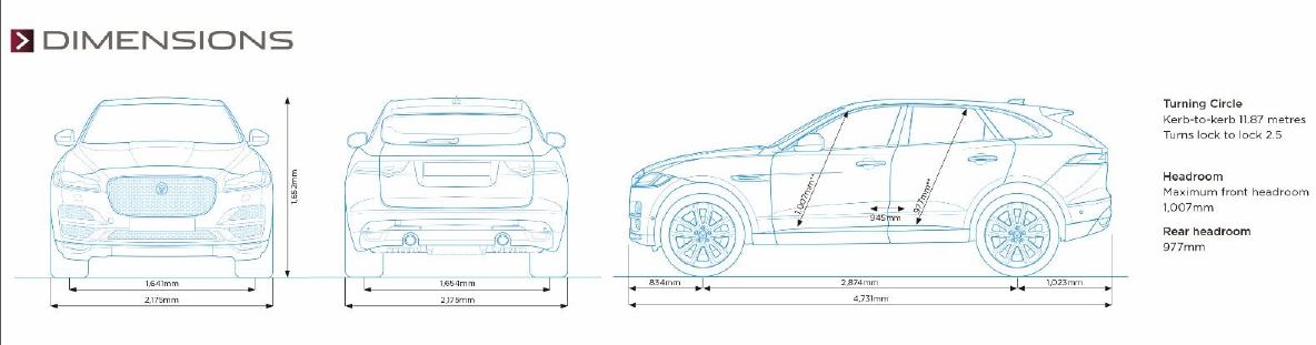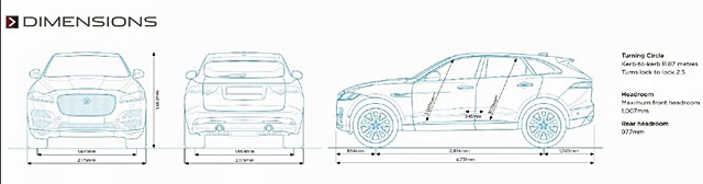 ออลนิว จากัวร์ เอฟ-เพซ มาพร้อมรูปลักษณ์อันแข็งแกร่งดุดันมีมิติตัวรถยาว 4,731 มม. กว้าง 2,175 มม. สูง 1,652 มม. ระยะฐานล้อ 2,874 มม. พร้อมองค์ประกอบต่างๆ อันเหนือระดับ เช่น ไฟหน้า Full LED ทรงเพรียว ล้อขนาด 22 นิ้ว และโอเวอร์แฮงด้านหน้าสั้น ที่สะท้อนภาพยนตรกรรมที่สร้างสรรค์ขึ้นจากแนวคิดดีไซน์ของ C-X17 ออลนิว จากัวร์ เอฟ-เพซ คือรถยนต์ขนาด 5 ที่นั่งที่ให้ความสะดวกสบายในการโดยสารสูงสุด ภายในคือการผสมผสานอย่างลงตัวระหว่างวัสดุและการตกแต่งระดับพรีเมียม ความพิถีพิถันในรายละเอียด และความหรูหรา เช่นเบาะหลังปรับเอนด้วยไฟฟ้า และเทคโนโลยีสุดล้ำอย่างระบบอินโฟเทนเมนต์ InControl Touch Pro และแผงคอนโซลพร้อมจอแสดงผลความละเอียดสูงขนาด 12.3 นิ้ว