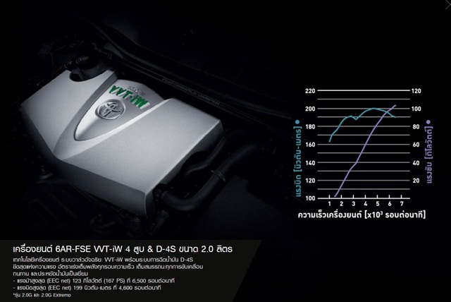 สมรรถนะเครื่องยนต์เบนซิน 4 สูบ 16 วาล์ว VVT-iW 2.0 ลิตร ระบบการฉีดน้ำมันแบบ D-4S และเกียร์อัตโนมัติ 6 สปีดพร้อม Sequential Shift กำลังสูงสุด 167 แรงม้า ที่ 6,500 รอบต่อนาที และแรงบิดสูงสุด 199 นิวตันเมตร ที่ 4,600 รอบต่อนาทีแต่ยังคงไว้ซึ่งความประหยัดน้ำมัน รวมไปถึงระบบความปลอดภัยมาตรฐานระดับสากลที่ครบครัน เช่น กระจกมองข้างปรับอัตโนมัติขณะถอยหลัง (2-Side Reverse Link & Auto Retractable) สะดวกและปลอดภัยยิ่งขึ้น ด้วยระบบปรับลดระดับกระจกอัตโนมัติ เมื่อเข้าเกียร์ถอย และพับเก็บได้อัตโนมัติ กล้องมองหลังพร้อม Back Guide Monitor ระบบควบคุมการทรงตัว VSC ระบบช่วยเตือนมุมอับสายตาที่กระจกมองข้าง (Blind Spot Monitor) ระบบช่วยเตือนขณะถอยรถ RCTA (Rear Cross Traffic Alert) เป็นต้น