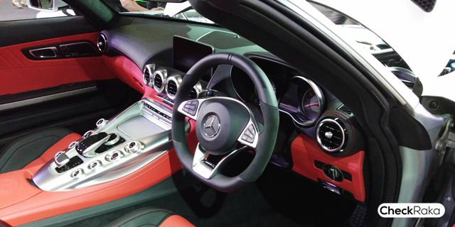 ภายในได้รับอิทธิพลมาจากกีฬามอเตอร์สปอร์ต โดยเบาะนั่งถูกปรับให้ต่ำลงเพื่อให้ผู้ขับรู้สึกเป็นหนึ่งเดียวกับตัวรถ และยังเป็นเบาะนั่งแบบ AMG Sports Bucket หุ้มด้วยหนัง Nappa และเส้นใย DINAMICA Microfibre ช่วยปกป้องลำตัวด้านข้างได้ดีแม้จะขับขี่ในความเร็วสูง โดยที่ผู้เป็นเจ้าของสามารถเลือกติดตั้งเบาะแบบ AMG Performance และอุปกรณ์เสริมต่างๆ ได้ อาทิ เข็มขัดนิรภัยสีเหลือง ชุดแผงหน้าปัดสีเหลือง หรือชุดแต่งห้องโดยสาร AMG Interior Night ได้