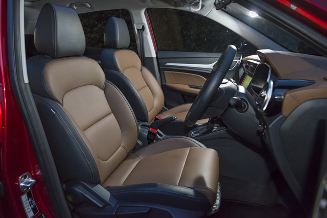 ในส่วนของการออกแบบภายใน MG ZS X จะตกแต่งด้วยสีทูโทน (ดำ-น้ำตาล) สะท้อนความหรูหราและสปอร์ตตามแบบรถยุโรป รวมถึงเลือกใช้วัสดุแบบ Soft Touch ช่วยเพิ่มให้ดูพรีเมียมมากขึ้นถึงแม้ว่าในบางจุดอาจจะต้องปรับปรุงอีกสักเล็กน้อยแต่ถ้าคิดถึงราคาที่ไม่แพงมากนักก็พอจะมองข้ามไปได้ เบาะนั่งด้านหลังสามารถพับแยกส่วนได้แบบ 60:40 ช่วยเพิ่มพื้นที่เก็บสัมภาระ โดยที่เบาะคู่หน้าจะไม่ใช่ระบบไฟฟ้า เบาะผู้ขับปรับได้ 6 ทิศทาง ส่วนผู้โดยสารด้าหน้าปรับได้ 4 ทิศทาง