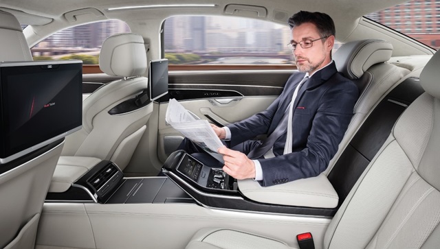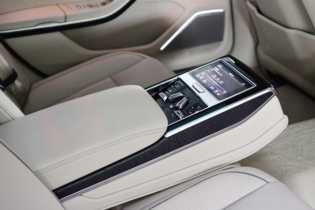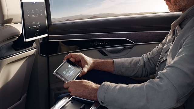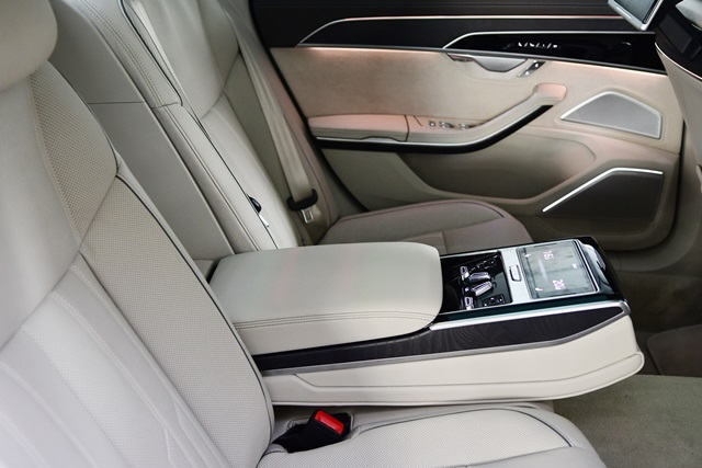 ตำแหน่งผู้โดยสารด้านหลัง The new Audi A8 L ได้รับการออกแบบให้เพิ่มความสะดวกในการใช้งานด้วยการควบคุมการทำงานของระบบต่างๆ ในรถด้วยชุดรีโมทคอนโทรลที่ติดตั้งมาให้ พร้อมจอทัชสกรีนสำหรับการสั่งการทำงานแบบไฮ-เรส ขนาด 5.7 นิ้ว ใกล้เคียงกับขนาดของโทรศัพท์มือถือทั่วไป โดยผู้โดยสารด้านหลังสามารถควบคุมได้ทั้งการเปิดระบบอุ่นเบาะนั่ง การปรับตำแหน่งเบาะนั่ง ระบบปรับอากาศที่เป็นแบบอัตโนมัติแยก 4 โซน หรือว่าเปิดระบบนวด ม่านบังแดด
