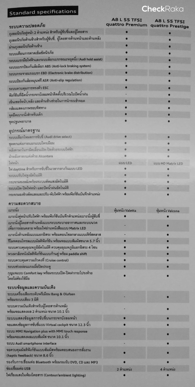- A8 L 55 TFSI quattro Premium เครื่องยนต์เบนซิน 340 แรงม้า ราคา 6,799,000 บาท