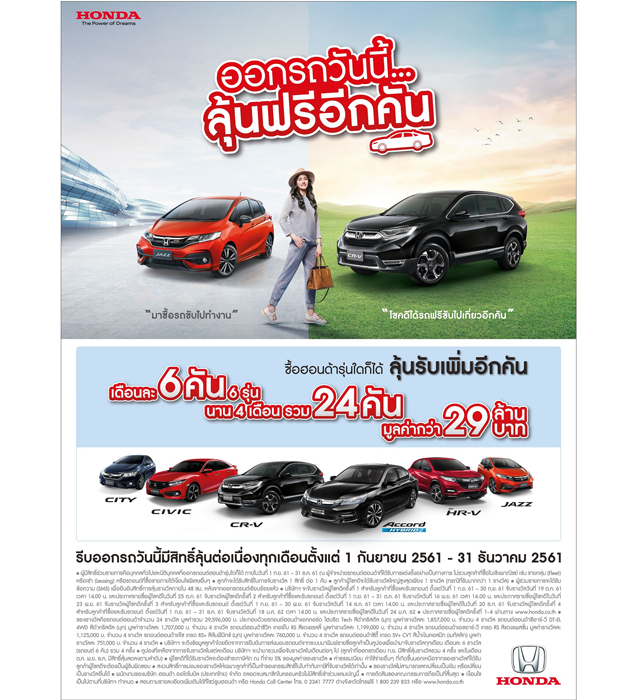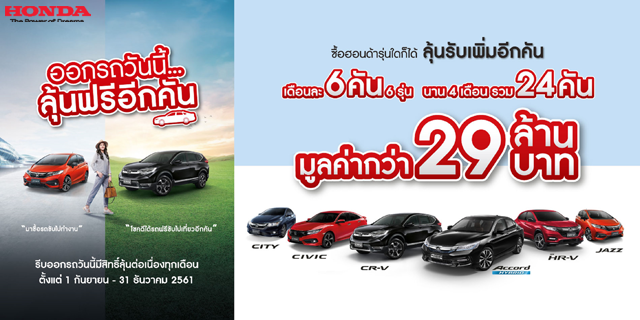 ฮอนด้า เอาใจลูกค้า กับแคมเปญ "ออกรถวันนี้...ลุ้นฟรีอีกคัน" ร่วมลุ้นรับรถยนต์ฮอนด้า มูลค่ากว่า 29 ลบ.