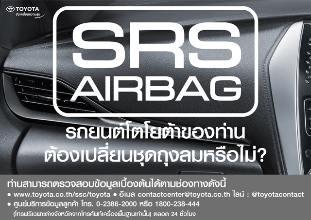 บริษัทฯ จึงขอเชิญชวนลูกค้าที่ยังไม่ได้นำรถเข้ารับการตรวจสอบ และเปลี่ยนชิ้นส่วนในชุดถุงลมเสริมความปลอดภัย สามารถนัดหมายเพื่อเข้ารับบริการ ได้ที่ศูนย์บริการของผู้แทนจำหน่ายโตโยต้า ทั่วประเทศ โดยไม่เสียค่าใช้จ่ายใดๆ หรือตรวจสอบข้อมูลเบื้องต้นได้ที่เว็บไซต์