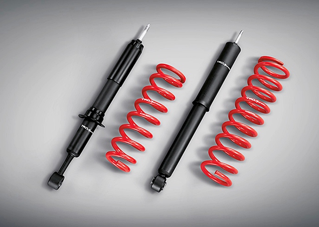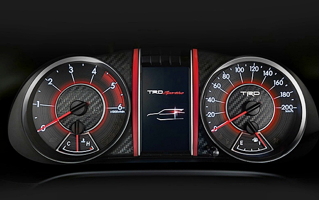 ภายในตกแต่งโทนสีแดง-ดำ พร้อมชุดแต่งลายคาร์บอน เคฟล่า กับแถบโครเมียมรมดำ มาตรวัดเรื่องแสง Optitron ใหม่ ดีไซน์ TRD เครื่องเสียงพร้มอระบบ T-Connect ลำโพง 9 ตำแหน่ง 11 ตัว ปุ่มสตาร์ทเครื่องยนต์พร้อมสัญลักษณ์ TRD กุญแจรีโมทย์ พร้อมตรง TRD