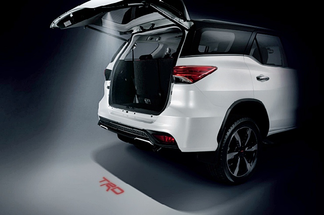 TOYOTA Fortuner TRD Sportivo ใหม่ ปรับชุดแต่งสวย สปอร์ตดุดันยิ่งขึ้น มาพร้อมกระจังหน้าสีดำ กันชนหน้าและไฟตัดหมอกลายใหม่ กันชนท้ายพร้อมสเกิร์ตหลัง คิ้วประตูท้ายดำเมทัลลิค ประตูท้ายไฟฟ้าพร้อมไฟส่องสว่างรูป TRD ล้อแม็ก TRD 20 นิ้ว ปลายท่อไอเสีย สคัฟเพลท TRD หลังคาสปอร์ต Black top