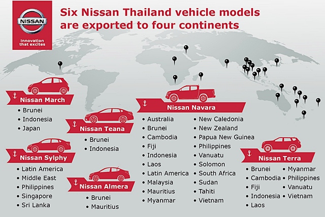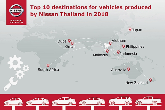นิสสัน ประเทศไทย เริ่มทำการส่งออกรถยนต์คุณภาพสูงที่ผลิตขึ้นในประเทศไทยนับตั้งแต่ปี พ.ศ.2542 โดย นิสสัน ฟรอนเทียร์ คือรถยนต์รุ่นแรกที่ถูกส่งออกไปยังประเทศออสเตรเลีย นับแต่นั้นเป็นต้นมา ฐานการผลิตของนิสสัน ประเทศไทย ได้มีการขยายตัวเพื่อรองรับการเติบโตที่เพิ่มสูงขึ้นจนได้รับการยอมรับให้เป็นศูนย์กลางการผลิตสำคัญของนิสสันในภูมิภาคเอเชียและโอเชียเนีย ทำหน้าที่สำคัญในการผลิตรถยนต์คุณภาพส่งถึงมือลูกค้า ผู้ขับขี่จากทั่วทุกมุมโลก ในปีที่ผ่านมา ตลาดส่งออกสูงสุด 3 อันดับแรกของนิสสัน ประเทศไทย ได้แก่ ฟิลิปปินส์ ออสเตรเลีย และญี่ปุ่น ตามด้วย อินโดนีเซีย มาเลเซีย แอฟริกาใต้ เวียดนาม นิวซีแลนด์ ดูไบ และโอมาน