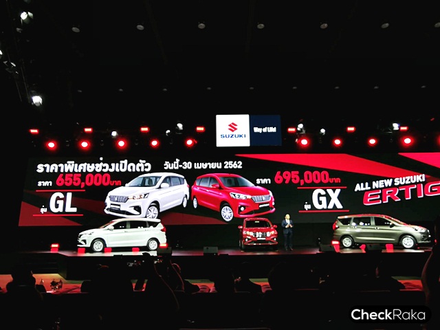 All New Suzuki ERTIGA โดยในรุ่น GL (AT) ราคาจำหน่ายอยู่ที่ 655,000 บาท และ GX (AT) ราคาจำหน่ายอยู่ที่ 695,000 บาท