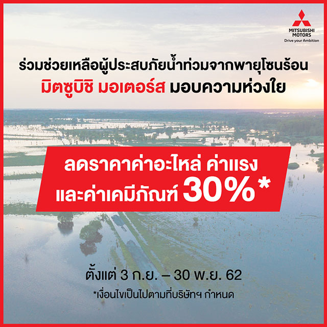 มิตซูบิชิ มอเตอร์ส ออกแคมเปญช่วยผู้ประสบอุทกภัย ลดราคาค่าอะไหล่ 30% เพื่อแบ่งเบาภาระค่าใช้จ่าย