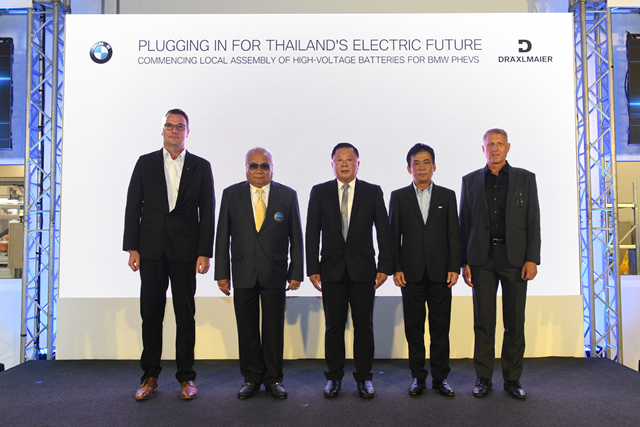 มร. อูเว่ ควาส (ซ้ายสุด) กรรมการผู้จัดการ ร่วมด้วย แดร็คเซิลไมเออร์ กรุ๊ป นำโดย มร. แกร์ฮาร์ด แอร์เนสแบร์เกอร์ (ขวาสุด) ผู้อำนวยการโรงงาน ร่วมพิธีเปิดโรงงานประกอบแบตเตอรี่แรงดันสูงสำหรับบีเอ็มดับเบิลยู กรุ๊ปแห่งเดียวในภูมิภาคอาเซียน ณ โรงงานของแดร็คเซิลไมเออร์ กรุ๊ป ในนิคมอุตสาหกรรมดับบลิวเอชเอ ชลบุรี 2 โดยมีคุณกรณ์ภัฐวีร์ ม่วงน้อย