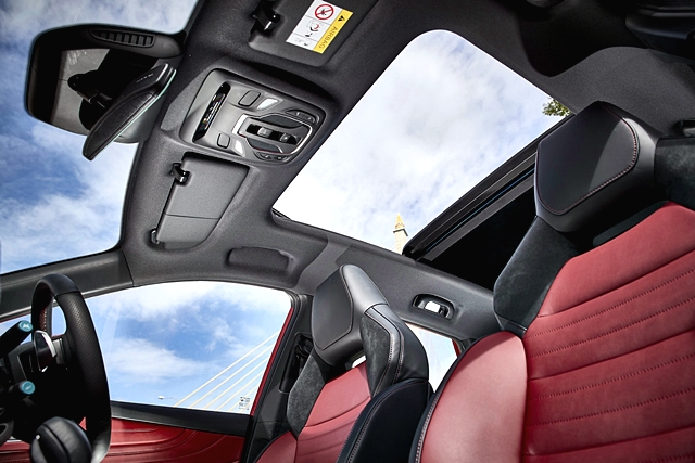 ภายในห้องโดยสาร ได้รับการออกแบบให้มีความโค้งมนโอบรับสรีระ พร้อมการเล่นระดับมีสไตล์และตกแต่งด้วยวัสดุภายในแบบ Soft Touch ครอบคลุมทั้งบริเวณคอนโซลหน้า และแผงประตูทั้งด้านหน้าและด้านหลัง เพิ่มความพรีเมี่ยมยิ่งขึ้นด้วยเบาะนั่งคู่หน้าปรับด้วยไฟฟ้าแบบ Bucket Seat ทรงสปอร์ตสีดำสลับแดงที่มีส่วนหุ้มด้วยวัสดุ Alcantara (เฉพาะรุ่น X) ในขณะที่เบาะหลังนั่งสบายปรับพับได้แบบ 60:40 พร้อมพนักพิง ปรับองศาได้และที่วางแขนขนาดใหญ่ โดดเด่นยิ่งขึ้นด้วยไฟในห้องโดยสารแบบ Interactive Ambient Light ที่มีแสงต้อนรับทันทีที่เปิดประตูและสามารถปรับโทนแสงภายในห้องโดยสารได้มากถึง 64 เฉดสี รวมทั้งยังสามารถปรับเปลี่ยนแบบอัตโนมัติตามโหมดการขับขี่ พร้อมหลังคาซันรูฟแบบ Panoramic Sunroof ขนาดใหญ่ 1.1 ตารางเมตร