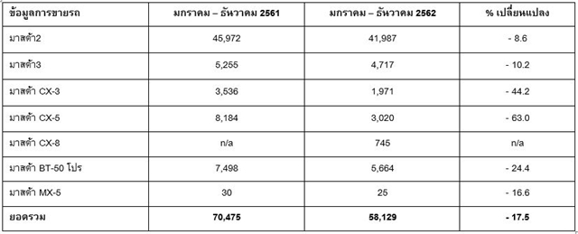 นายชาญชัย ตระการอุดมสุข ประธานบริหาร บริษัท มาสด้า เซลส์ (ประเทศไทย) จำกัด กล่าวว่า ตลาดรถยนต์ในปี 2562 ที่ผ่านมา ถูกจับตามองเป็นอย่างยิ่งโดยผู้เชี่ยวชาญคาดการณ์ว่ายอดรวมของอุตสาหกรรมรถยนต์น่าจะอยู่ที่ประมาณ 1 ล้านคัน ใกล้เคียงกับปี 2561 อยู่ที่ 1.04 ล้านคัน และตัวเลขรวมก็ทะลุ 1 ล้านคัน (ประมาณการ) ใกล้กับปีที่ผ่านมา ทำให้มียอดขายรวมได้สูงถึง 58,129 คัน ลดลงประมาณ 17.5% และครองส่วนแบ่งการตลาด 5.8% แบ่งออกเป็นรถยนต์นั่ง 46,704 คัน รถอเนกประสงค์จำนวน 5,736 คัน โดยเฉพาะการเปิดตัว