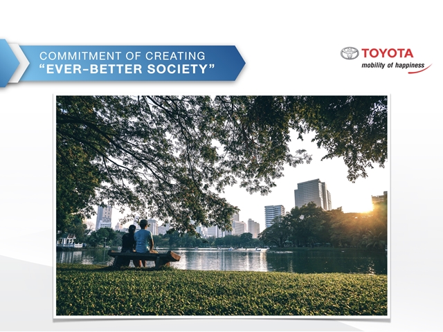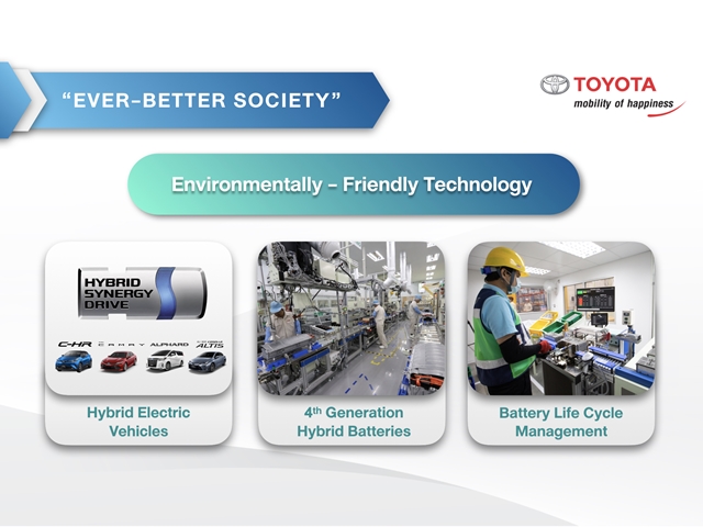 ตลอดระยะเวลากว่า 57 ปีของการดำเนินธุรกิจในประเทศไทย โตโยต้ามีความตั้งใจอย่างแน่วแน่ที่จะเดินหน้าพัฒนาให้เกิด "สังคมที่ดียิ่งขึ้น" (Ever-Better Society) ผ่านโครงการต่างๆ อาทิ โครงการพัฒนาเทคโนโลยีที่เป็นมิตรกับสิ่งแวดล้อมผ่านการแนะนำรถยนต์ไฮบริดในหลากหลายรุ่น รวมไปถึงการผลิตแบตเตอรี่รถยนต์ไฮบริดในประเทศไทย และการพัฒนาไฮบริดเจเนอเรชั่นที่ 4 ไม่เพียงเท่านี้ โตโยต้ายังพัฒนาระบบการจัดการแบตเตอรี่ไฮบริดแบบครบวงจร ซึ่งเราเชื่อว่าความพยายามทั้งหมดนี้สะท้อนให้เห็นถึงความมุ่งมั่นในการเป็นผู้นำการสร้างสรรค์สังคมที่เป็นมิตรต่อสิ่งแวดล้อมอย่างแท้จริง