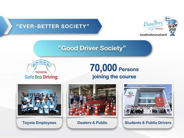 นอกจากนี้โตโยต้ายังเน้นย้ำต่อการพัฒนาคุณภาพชีวิตของคนไทยในด้านต่างๆ มาอย่างต่อเนื่อง เริ่มจากโครงการที่มีมากกว่า 30 ปี นั่นคือ "โตโยต้า ถนนสีขาว" โครงการที่มุ่งมั่นในการส่งเสริมความปลอดภัยในการใช้รถใช้ถนน เพื่อนำไปสู่การสร้าง "สังคมคนขับรถดี" (Good Driver Society) โดยเฉพาะในปีที่ผ่านมากับ "หลักสูตรการขับขี่ปลอดภัย ประหยัดพลังงาน และรักษาสิ่งแวดล้อม" (Safe Eco Driving) ได้รับการตอบรับเป็นอย่างดีจากผู้แทนจำหน่าย ประชาชน นักศึกษาและผู้ขับขี่รถสาธารณะ โดยปัจจุบันมีผู้เข้าร่วมโครงการมากกว่า 70,000 คน ซึ่งเป็นความตั้งใจของโตโยต้าในการที่จะมีบทบาทสำคัญในการสร้าง "สังคมคนขับรถดี" (Good Driver Society)