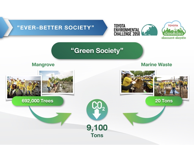 สำหรับโครงการด้านสิ่งแวดล้อม โตโยต้ามีอีกหนึ่งกิจกรรมที่สำคัญคือ "โตโยต้า ปลูกป่าชายเลน" (Toyota Mangrove Reforestation) ซึ่งเราดำเนินการมาอย่างต่อเนื่องภายใต้ชื่อ "โตโยต้า เมืองสีเขียว" (Toyota Green Town) โดยในปีนี้โตโยต้าวางแผนที่จะปลูกป่าชายเลนเพิ่มขึ้นอีก 50,000 ต้น ส่งผลให้จำนวนต้นไม้ที่เราปลูกนับตั้งแต่เริ่มต้นโครงการในปี 2547 มีรวมทั้งหมดถึง 692,000 ต้น