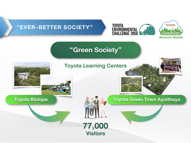 โตโยต้าเดินหน้าจัดกิจกรรมเก็บขยะชายเลน ต่อเนื่องเป็นปีที่ 2 โดยเรามีเป้าหมายเก็บขยะให้ได้ 20 ตันในปีนี้ ซึ่งเมื่อรวมกันทั้งหมดแล้วนับได้ว่าเราจะสามารถช่วยให้มีการดูดซับก๊าซคาร์บอนไดออกไซด์ได้กว่า 9,100 ตัน ในขณะเดียวกัน ด้วยความมุ่งมั่นที่จะสร้างสรรค์สังคมที่เป็นมิตรต่อสิ่งแวดล้อมอย่างยั่งยืน เราได้ตั้งเป้าหมายที่จะถ่ายทอดองค์ความรู้ด้านสิ่งแวดล้อมให้กับชุมชนในท้องถิ่นต่างๆ ผ่านศูนย์การเรียนรู้ 2 แห่งของเรา ได้แก่ "โตโยต้าไบโอโทป" (Toyota Biotope) ที่โรงงานประกอบรถยนต์โตโยต้า บ้านโพธิ์ และ "โตโยต้า เมืองสีเขียว อยุธยา" (Toyota Green Town Ayutthaya) ซึ่งประชาชนได้ให้ความสนใจศูนย์การเรียนรู้ทั้ง 2 แห่งนี้เป็นอย่างดี โดยมีจำนวนผู้เข้าเยี่ยมชมรวมตั้งแต่เปิดศูนย์ฯ กว่า 77,000 คน